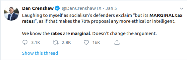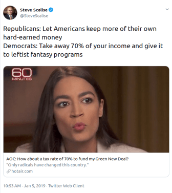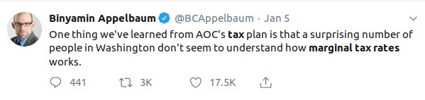 Last week freshman representative Alexandria Ocasio-Cortez set off a bit of a Twitter storm by suggesting a 70% marginal tax rate to fund her “Green New Deal.” Whether a 70% marginal tax rate would raise enough money to do so is a technical question and one I am not qualified to address in any meaningful way. Of more interest to me was the followup, in which various Republicans implied that her proposal would take 70% of some constituents’ incomes and Rep. Ocasio-Cortez shot back that they did not seem to understand progressive taxation or marginal tax rates. The exchanges jogged my memory in a way that illuminates the core problem of the modern Republican party.